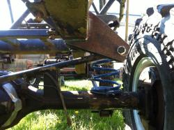 Le pont avant est "simplement" monté avec les tirants du Patrol sur les supports d'origine du châssis Land Rover car les diamètres des tiges et les silent-bloc de tirant sont identiques (qui a copié sur le copain????). Conservant la barre panhard du Patrol, un ancrage est réalisé sur le châssis.