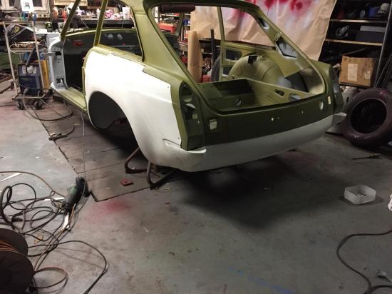 L'auto est repositionnée a plat sur des chandelles , les ailes arrière ainsi que la jupe sont collées avec une colle poliuréthane spéciale et provisoirement maintenues pendant 24h avec des riverts Pop qui seront supprimés.